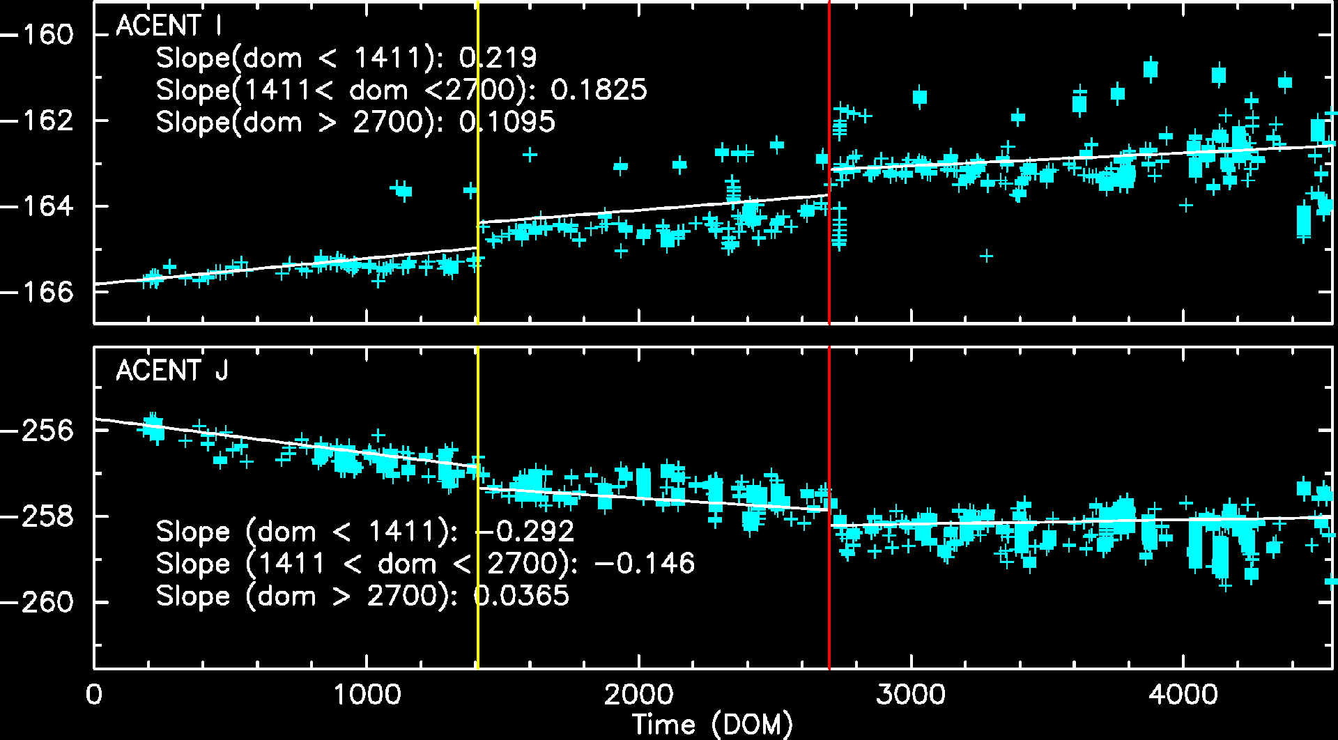 Fid light positions on ACA drift with time. The drift trends of Fid light 2 with ACIS-I and ACIS-S configurations are shown below.