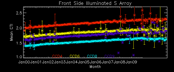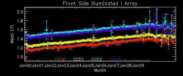 We report CTIs with a refined data definition. CTIs were computed for the temperature dependency corrected data. Please see CTI page for detailed explanation. CTI's are computed for Mn K alpha, and defined as slope/intercept x10^4 of row # vs ADU. Data file: here