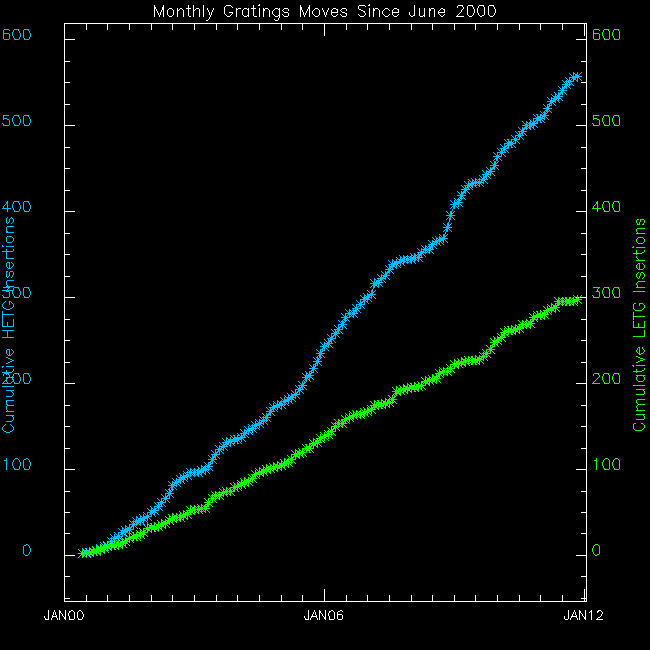 We plot the width of the zero order streak of ACIS/HETG observations and the width of the zero order image for HRC/LETG observations of point sources. No significant defocusing trend is seen at this time. See Gratings Focus pages.