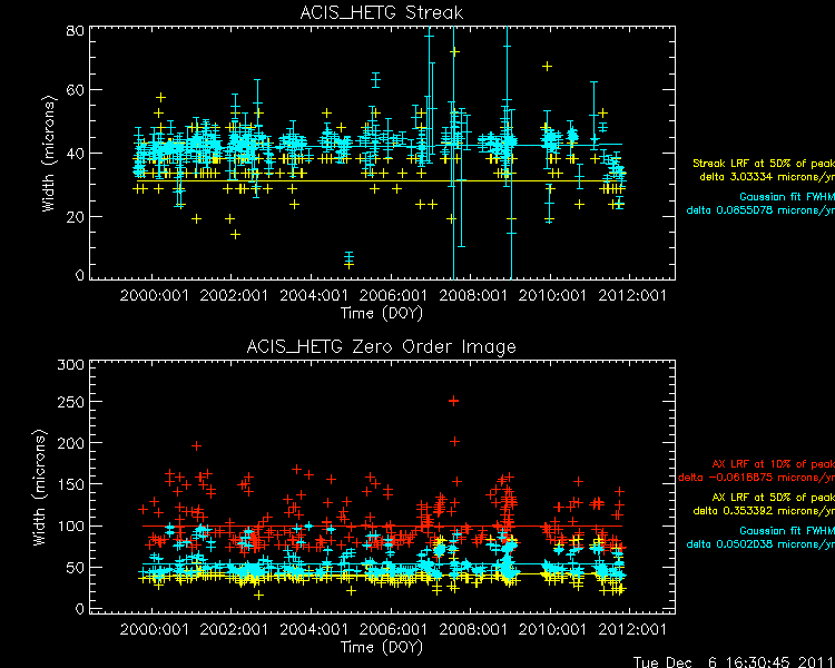 We plot the width of the zero order streak of ACIS/HETG observations and the width of the zero order image for HRC/LETG observations of point sources. No significant defocusing trend is seen at this time. See Gratings Focus pages. (NOTE: the figures are not updated from Mar 2009 due to a system problem.)