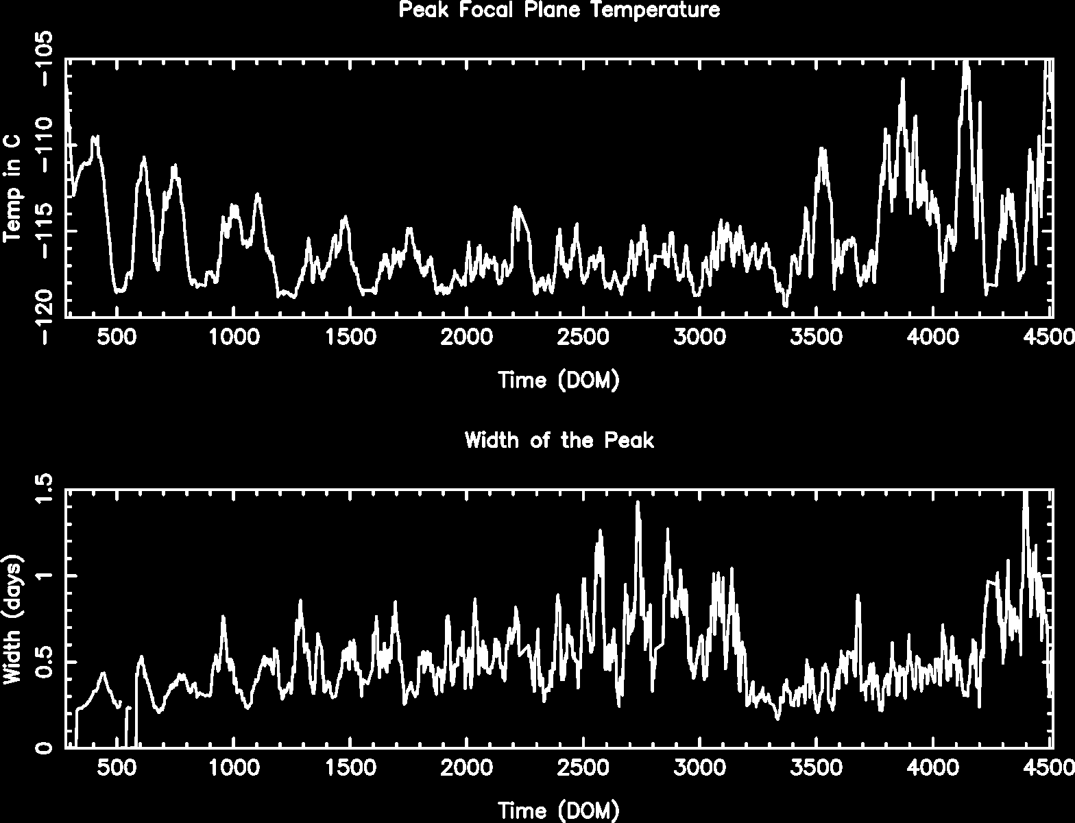 We are using 10 period moving averages to show trends of peak temperatures and peak widths. Note, the gaps in the width plot are due to missing/corrupted data.