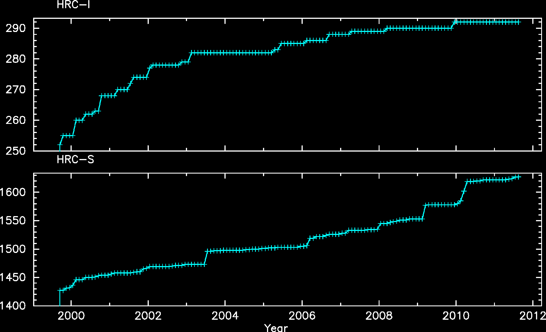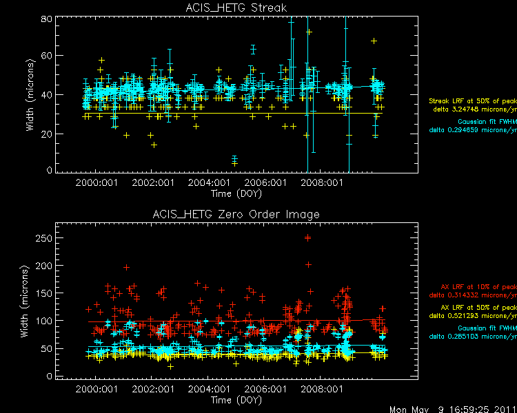 We plot the width of the zero order streak of ACIS/HETG observations and the width of the zero order image for HRC/LETG observations of point sources. No significant defocusing trend is seen at this time. See Gratings Focus pages. (NOTE: the figures are not updated from Mar 2009 due to a system problem.)