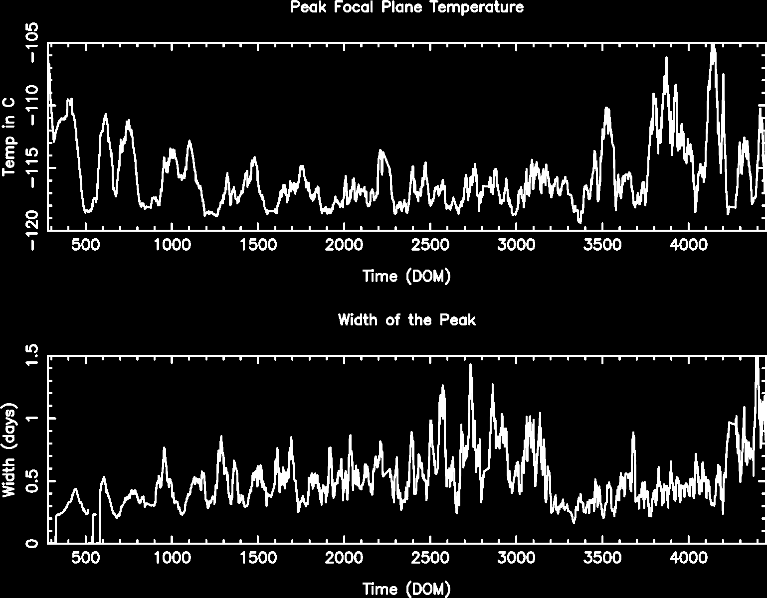 We are using 10 period moving averages to show trends of peak temperatures and peak widths. Note, the gaps in the width plot are due to missing/corrupted data.