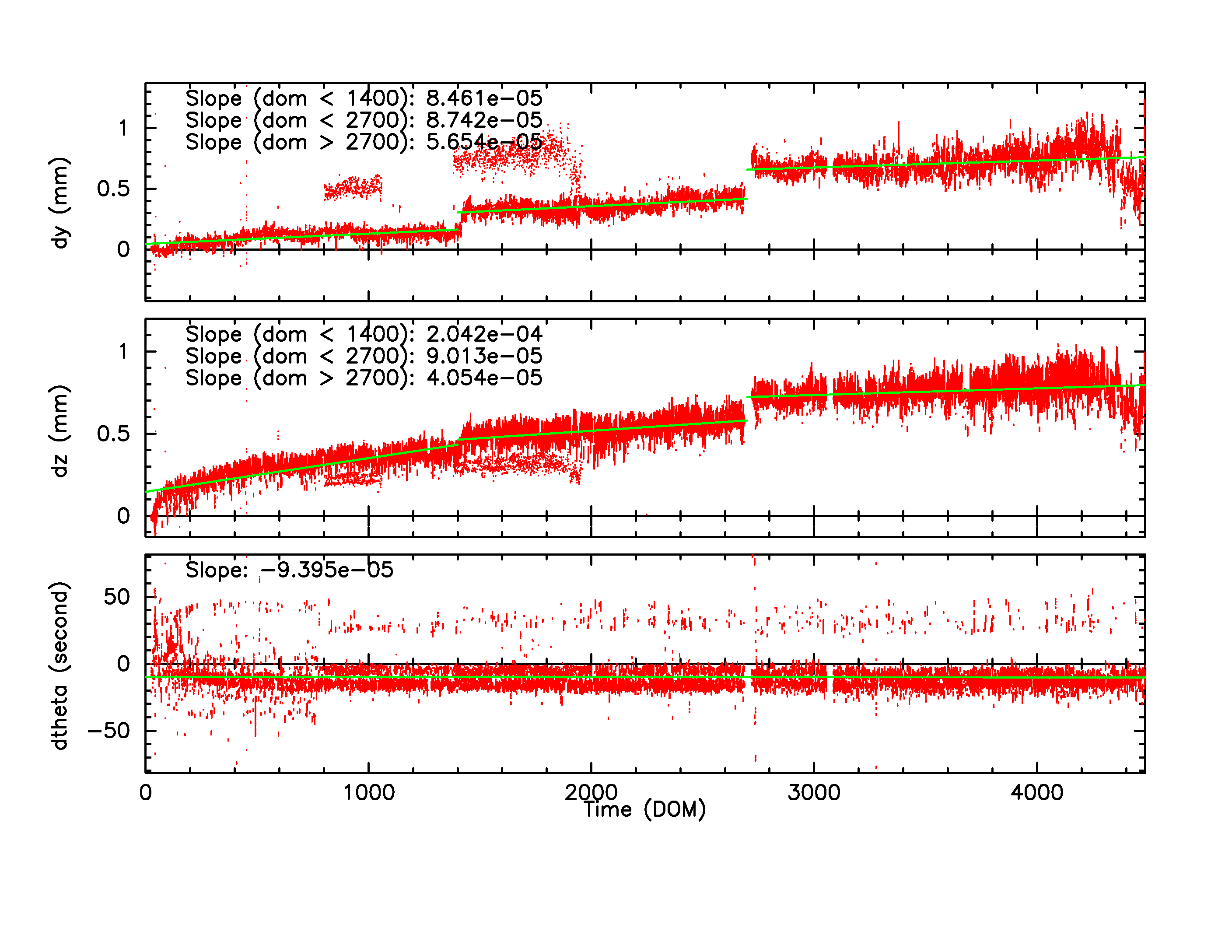 The sudden shift around DOM = 1400 and 2700 are due to fid light drift (see a memo by Aldcroft fiducial light drift). On the dtheta plot, two tracks are clearly observed. The track around 0.01 is due to HRC-I, and all others are clustered around -0.002. For more detail, please see SIM Shift and Twist Trend page