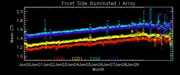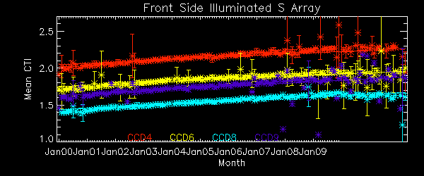 We report CTIs with a refined data definition. CTIs were computed for the temperature dependency corrected data. Please see CTI page for detailed explanation. CTI's are computed for Mn K alpha, and defined as slope/intercept x10^4 of row # vs ADU. Data file: here