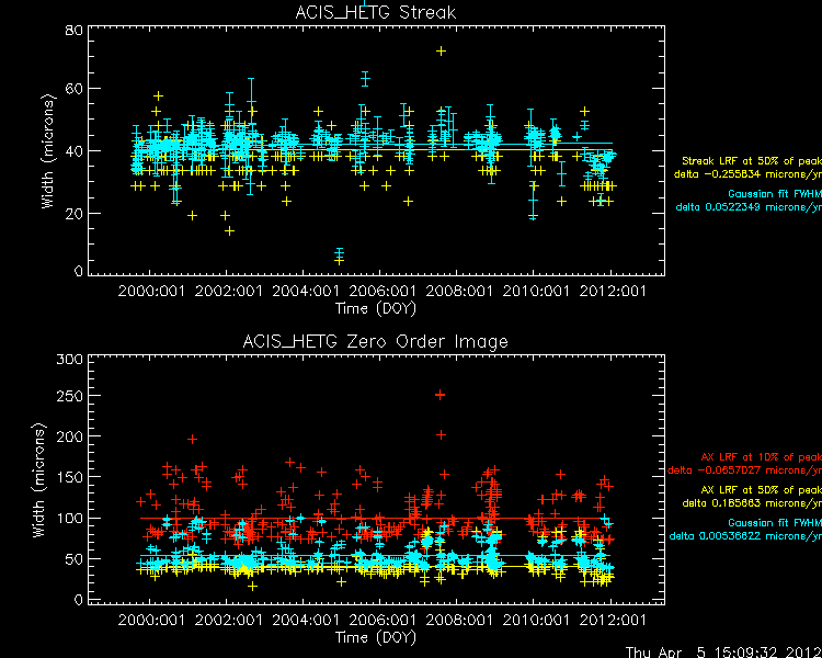 We plot the width of the zero order streak of ACIS/HETG observations and the width of the zero order image for HRC/LETG observations of point sources. No significant defocusing trend is seen at this time. See Gratings Focus pages.