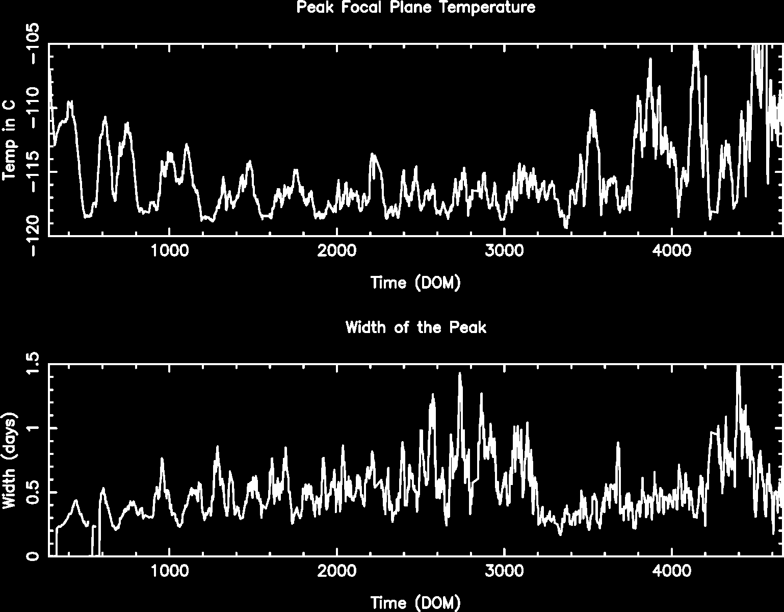 We are using 10 period moving averages to show trends of peak temperatures and peak widths. Note, the gaps in the width plot are due to missing/corrupted data.