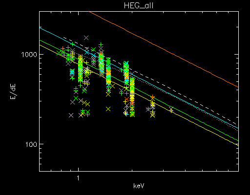 We plot E/dE vs. E for fits to detected lines with fwhm_error/fwhm less than 0.15 for the plus and minus arms of HEG, MEG, and LEG. Also shown are conservative (dotted line) and optimistic (dashed line) pre-launch resolving power expectations.