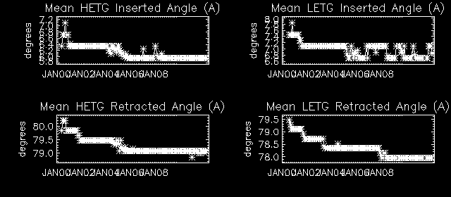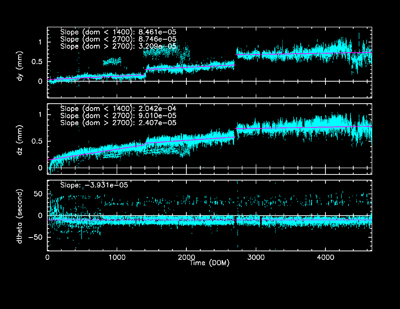 The sudden shift around DOM = 1400 and 2700 are due to fid light drift (see a memo by Aldcroft fiducial light drift). On the dtheta plot, two tracks are clearly observed. The track around 0.01 is due to HRC-I, and all others are clustered around -0.002. For more detail, please see SIM Shift and Twist Trend page