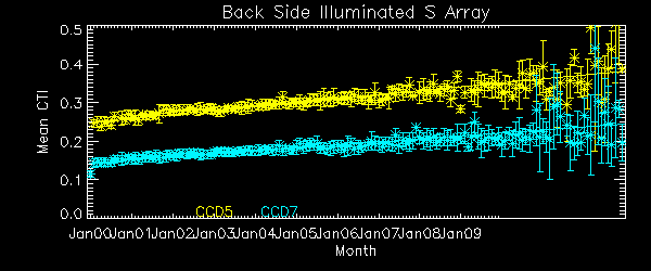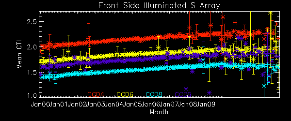 We report CTIs with a refined data definition. CTIs were computed for the temperature dependency corrected data. Please see CTI page for detailed explanation. CTI's are computed for Mn K alpha, and defined as slope/intercept x10^4 of row # vs ADU. Data file: here
