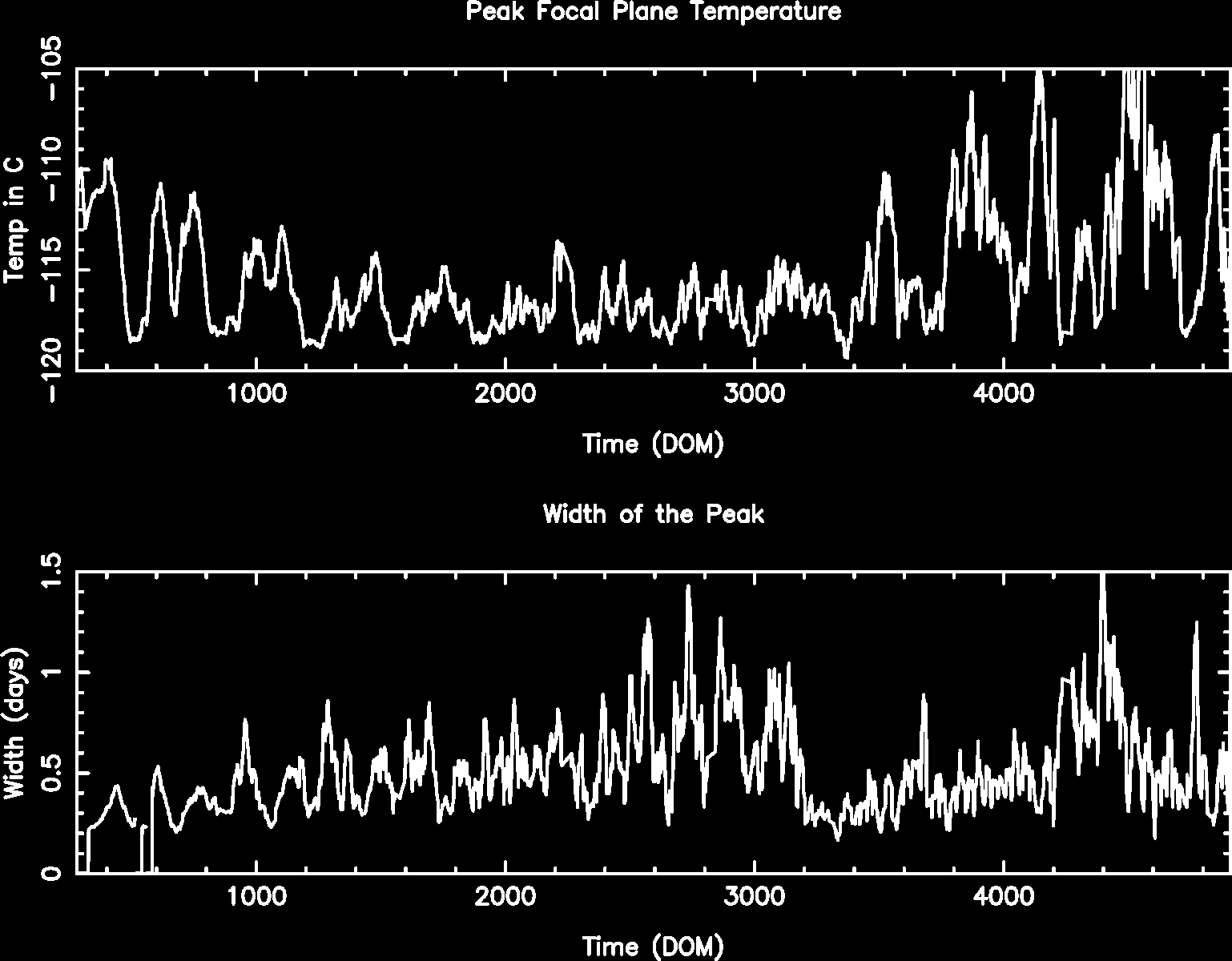 We are using 10 period moving averages to show trends of peak temperatures and peak widths. Note, the gaps in the width plot are due to missing/corrupted data.