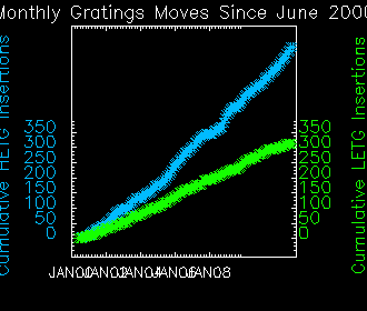 We plot the width of the zero order streak of ACIS/HETG observations and the width of the zero order image for HRC/LETG observations of point sources. No significant defocusing trend is seen at this time. See Gratings Focus pages.