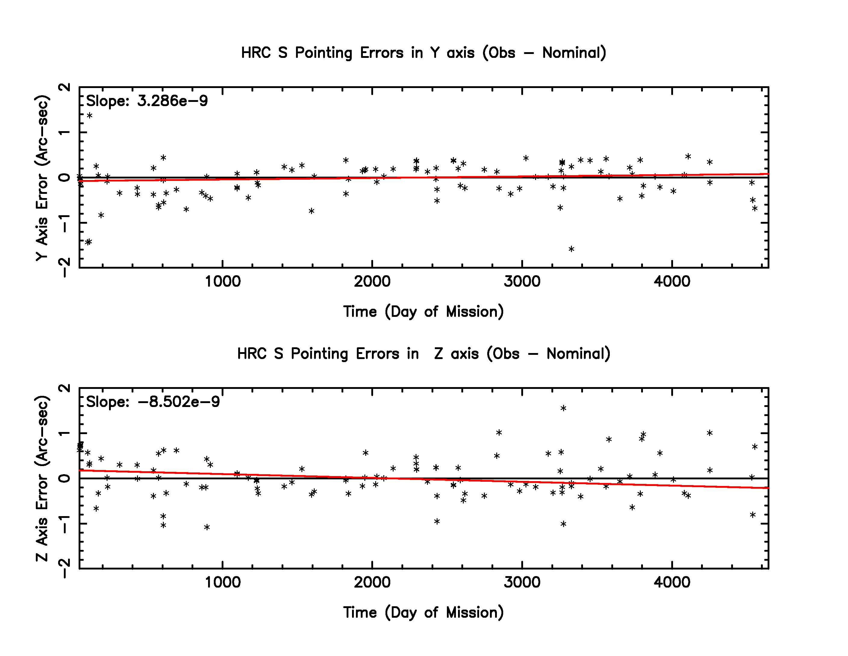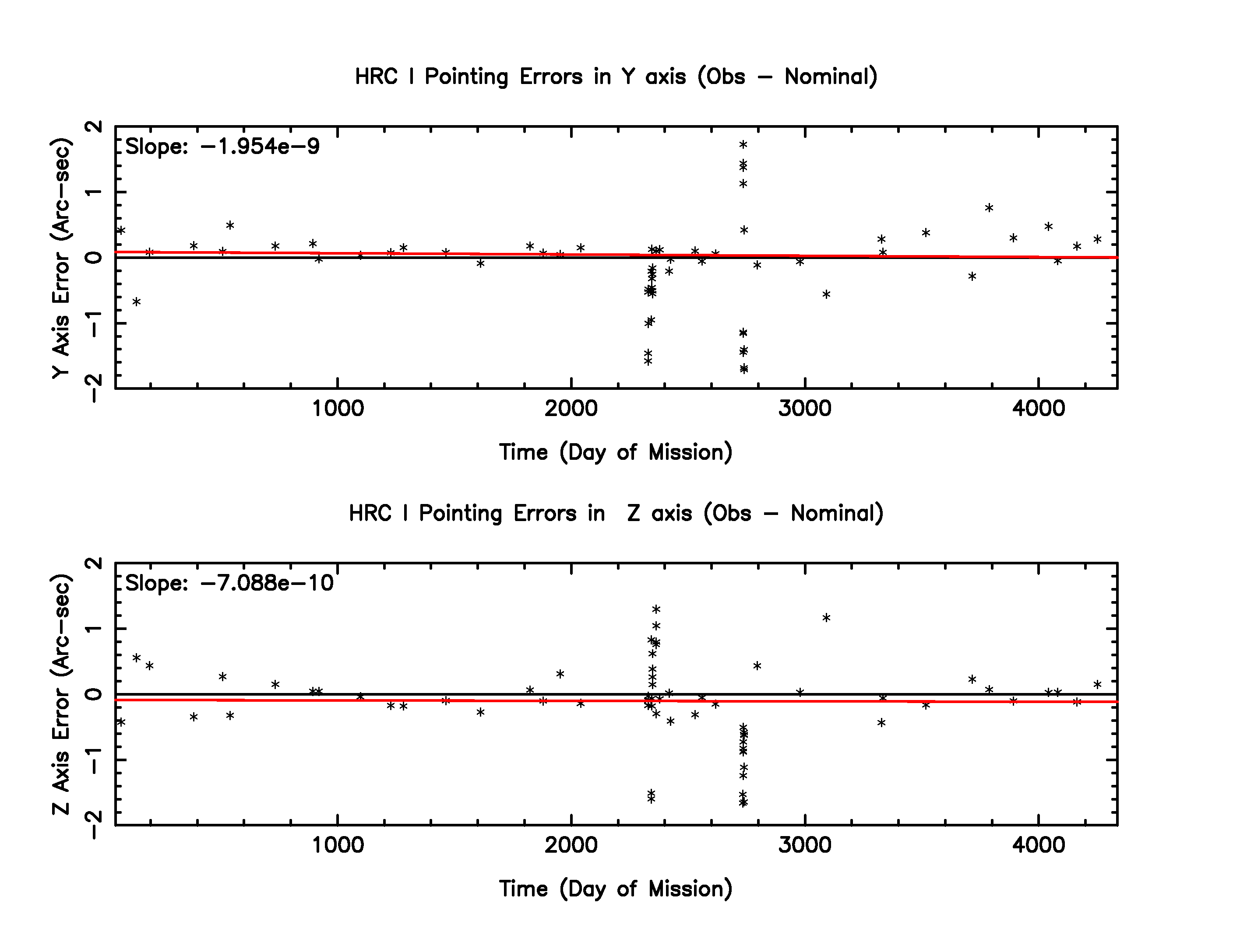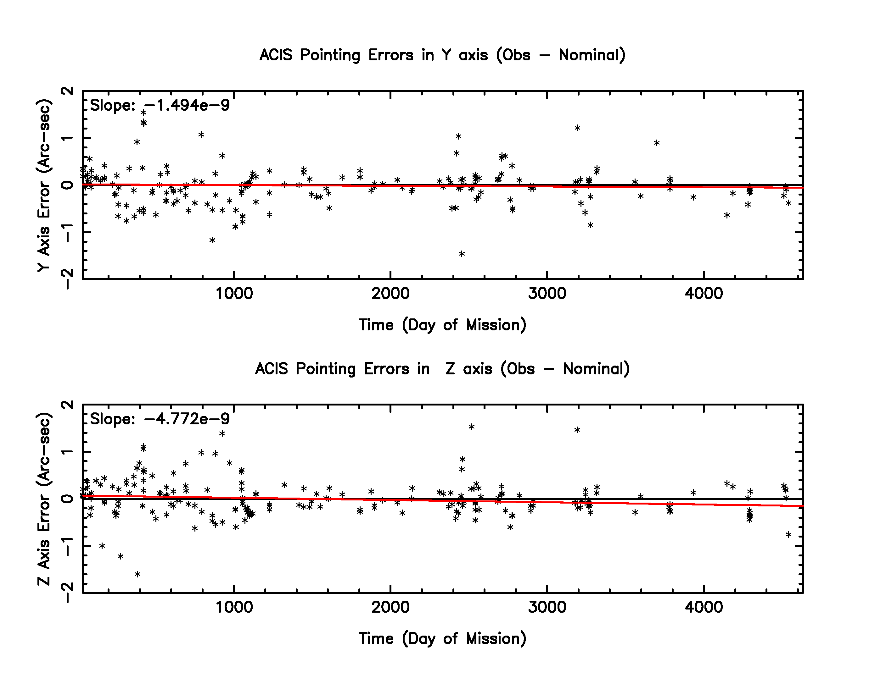 The following plots are the difference between coordinates obtained from Chandra observations and those obtained from existing catalogs vs time in day of mission.