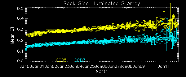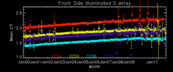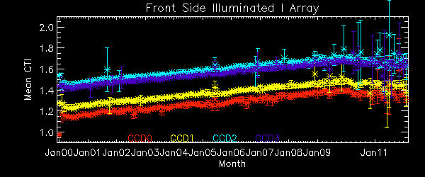 We report CTIs with a refined data definition. CTIs were computed for the temperature dependency corrected data. Please see CTI page for detailed explanation. CTI's are computed for Mn K alpha, and defined as slope/intercept x10^4 of row # vs ADU. Data file: here