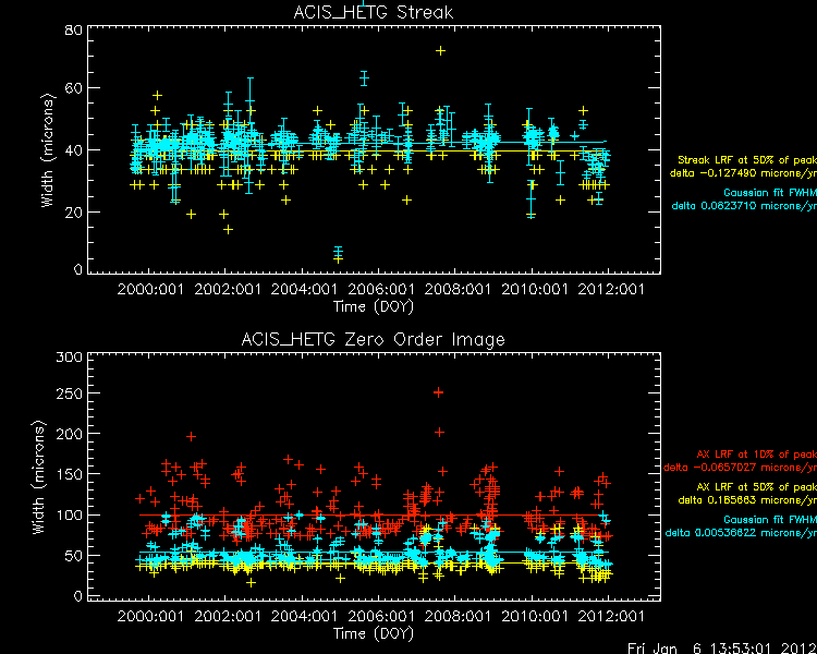 We plot the width of the zero order streak of ACIS/HETG observations and the width of the zero order image for HRC/LETG observations of point sources. No significant defocusing trend is seen at this time. See Gratings Focus pages.