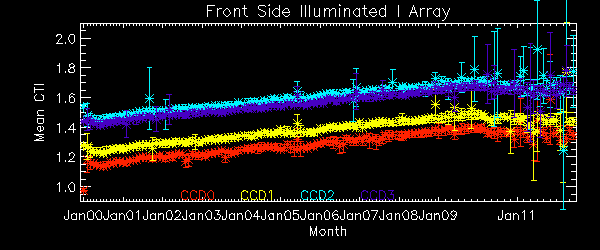 We report CTIs with a refined data definition. CTIs were computed for the temperature dependency corrected data. Please see CTI page for detailed explanation. CTI's are computed for Mn K alpha, and defined as slope/intercept x10^4 of row # vs ADU. Data file: here
