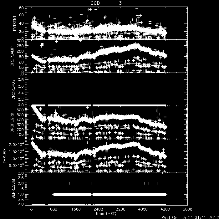 The links below are plots of stat1 quantities, showing on-board rejected events. The average EVTSENT, DROP_AMP, DROP_POS, DROP_GRD, THR_PIX, and maximum BERR_SUM obtained from L1 acis*stat1.fits files are plotted for each observation. CTI observations are plotted separately from regular science observations.