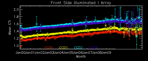 We report CTIs with a refined data definition. CTIs were computed for the temperature dependency corrected data. Please see CTI page for detailed explanation. CTI's are computed for Mn K alpha, and defined as slope/intercept x10^4 of row # vs ADU. Data file: here