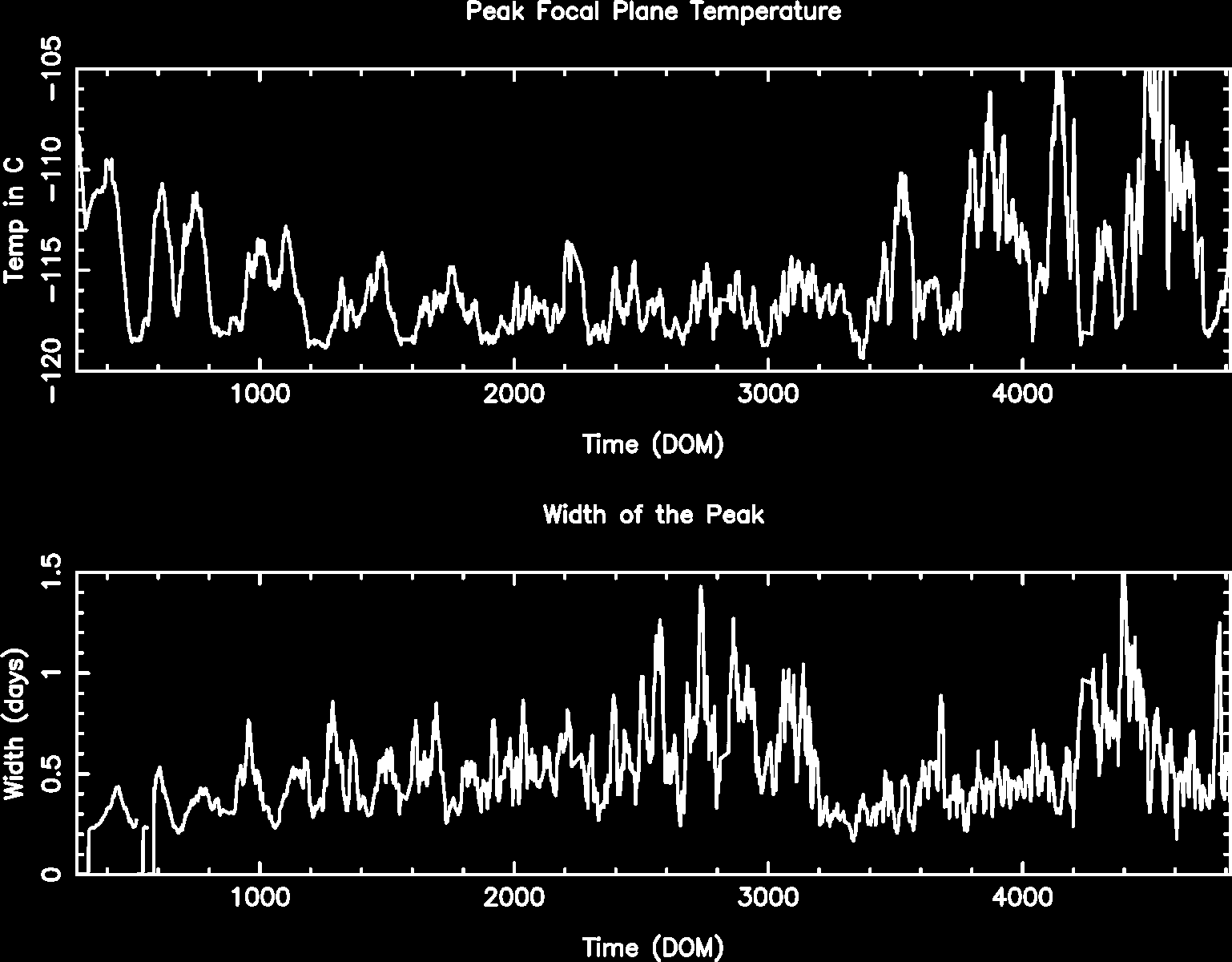 We are using 10 period moving averages to show trends of peak temperatures and peak widths. Note, the gaps in the width plot are due to missing/corrupted data.