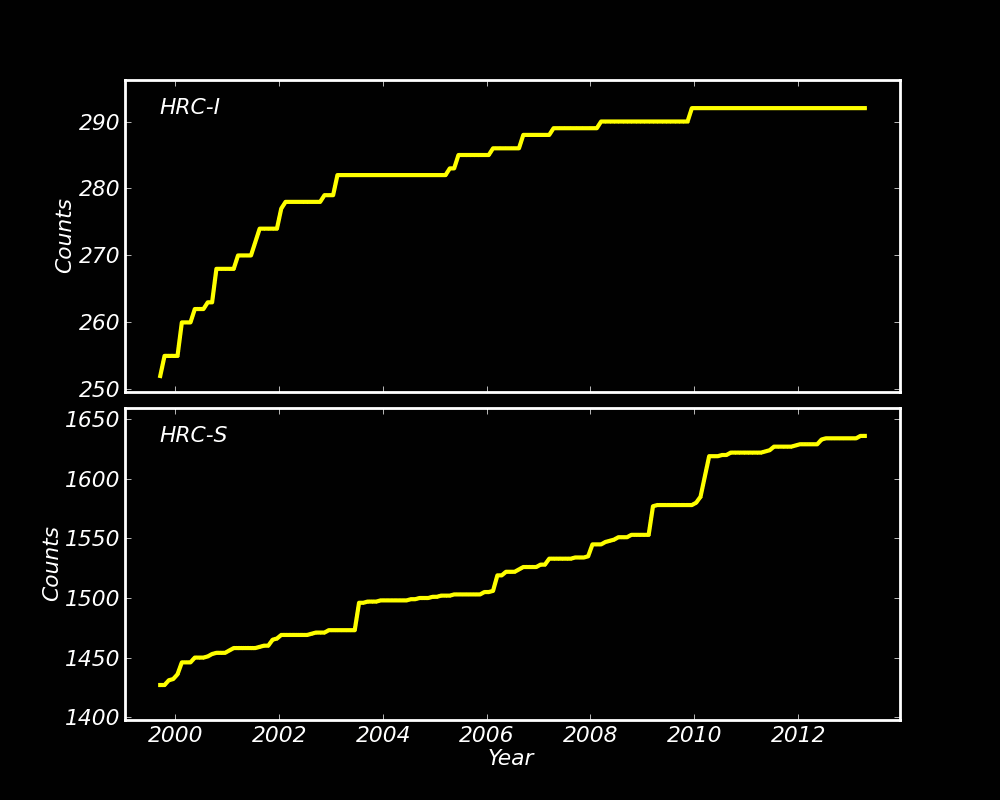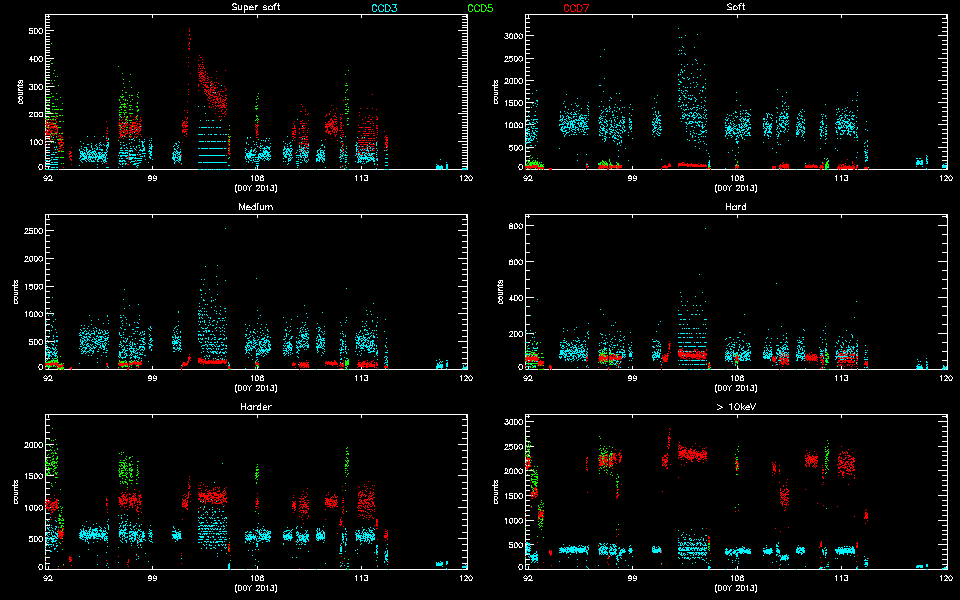 Statistics: # IMAGE NPIX MEAN RMS MIN MAX ACIS_apr13 6004901 7.824 12.518 0.0 3998 I2 node 0 262654 8.784760 3.648964 0.0 48.0 I2 node 1 262654 9.136184 4.259604 0.0 295.0 I2 node 2 262654 8.880562 3.663972 0.0 70.0 I2 node 3 262654 8.852977 6.318278 0.0 2515.0 I3 node 0 262654 9.155312 3.886116 0.0 42.0 I3 node 1 262654 9.631695 8.577258 0.0 185.0 I3 node 2 262654 8.963073 3.566923 0.0 66.0 I3 node 3 262654 9.012810 8.347025 0.0 3752.0 S2 node 0 262654 8.190353 3.533049 0.0 41.0 S2 node 1 262654 8.503852 3.992281 0.0 55.0 S2 node 2 262654 9.693968 9.597268 0.0 3847.0 S2 node 3 262654 10.657214 8.195270 0.0 426.0 S3 node 0 262654 18.929730 23.658039 0.0 246.0 S3 node 1 262654 14.965741 11.617347 0.0 137.0 S3 node 2 262654 12.001873 6.203058 0.0 86.0 S3 node 3 262654 10.159185 4.312437 0.0 57.0