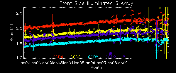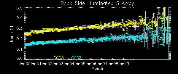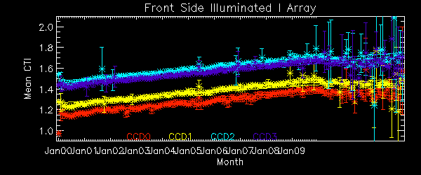 We report CTIs with a refined data definition. CTIs were computed for the temperature dependency corrected data. Please see CTI page for detailed explanation. CTI's are computed for Mn K alpha, and defined as slope/intercept x10^4 of row # vs ADU. Data file: here