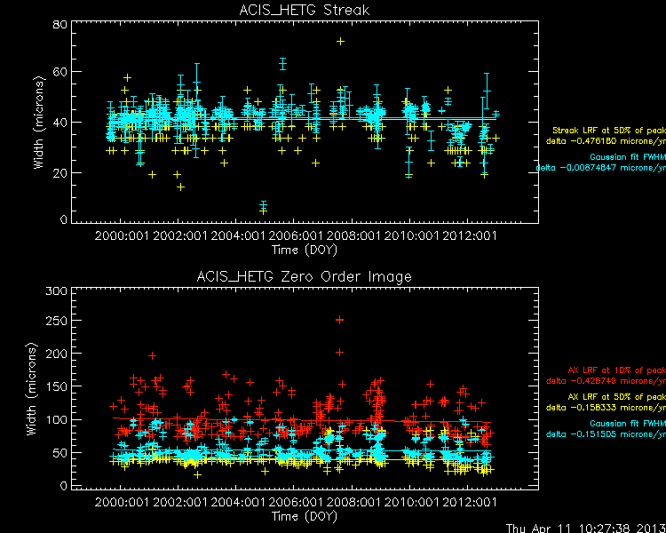 We plot the width of the zero order streak of ACIS/HETG observations and the width of the zero order image for HRC/LETG observations of point sources. No significant defocusing trend is seen at this time. See Gratings Focus pages.