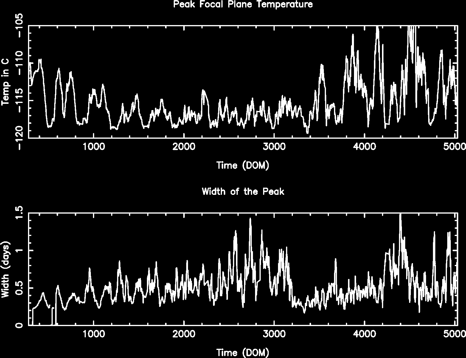 We are using 10 period moving averages to show trends of peak temperatures and peak widths. Note, the gaps in the width plot are due to missing/corrupted data.