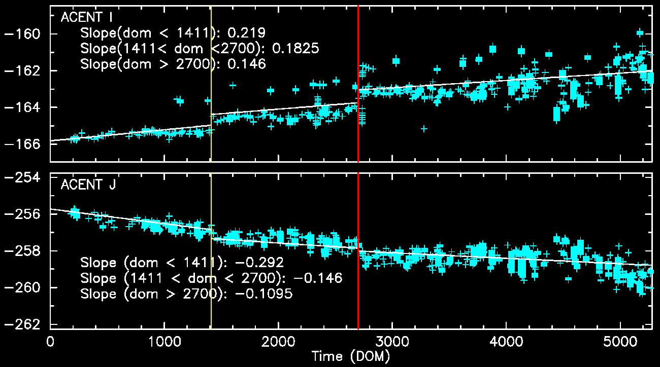 the change in a position per year (arcsec/yr). The vertical line on DOM = 1411 (Jun 1, 2003)