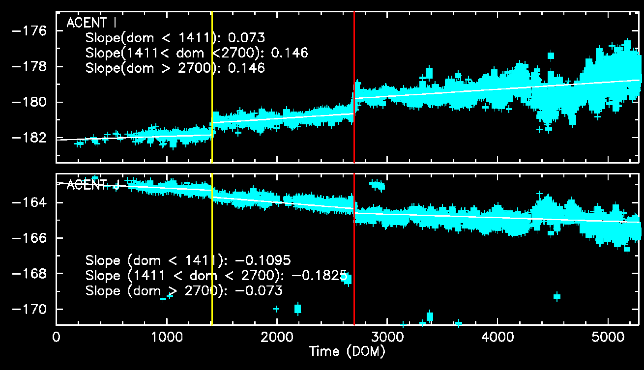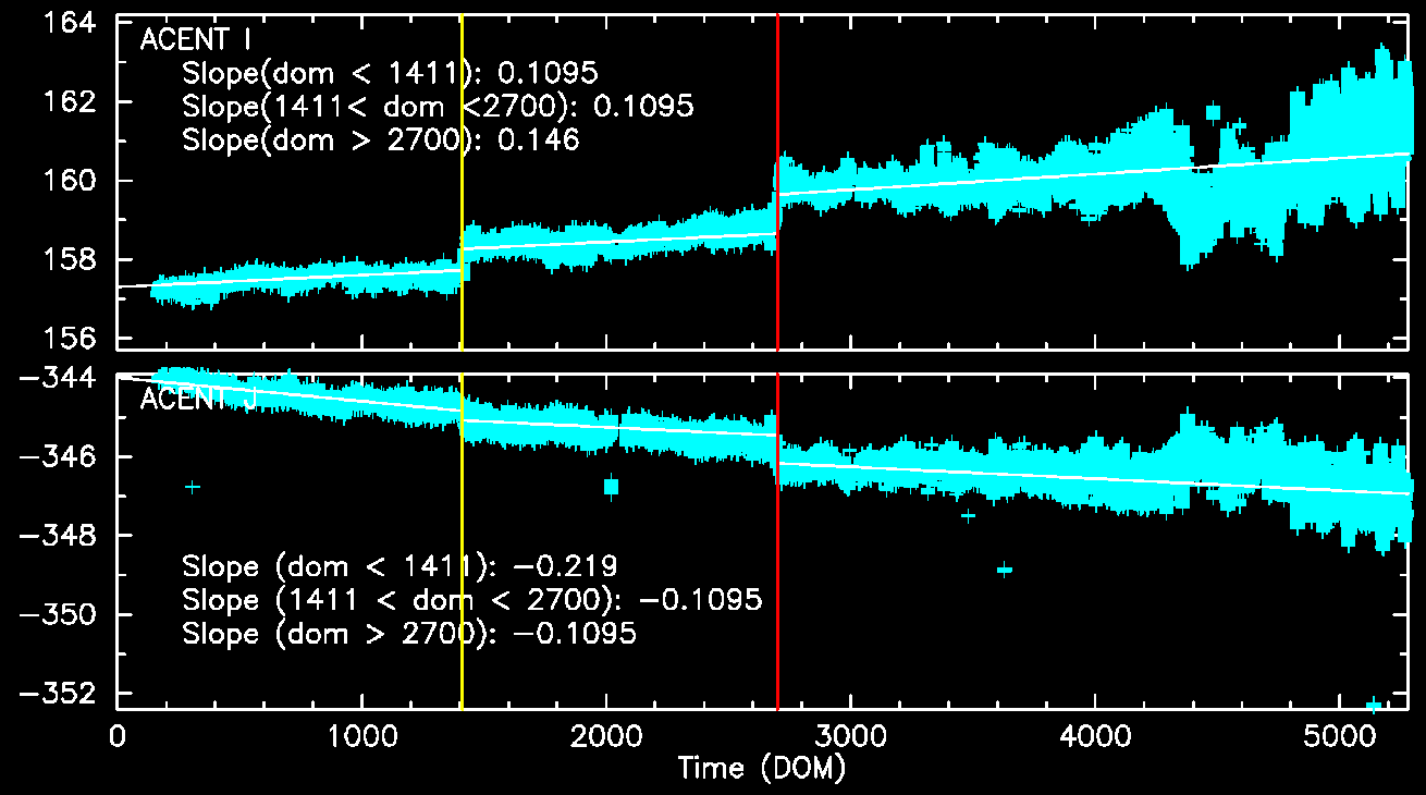 Fid light positions on ACA drift with time. The drift trends of Fid light 2 with ACIS-I and ACIS-S configurations are shown below.