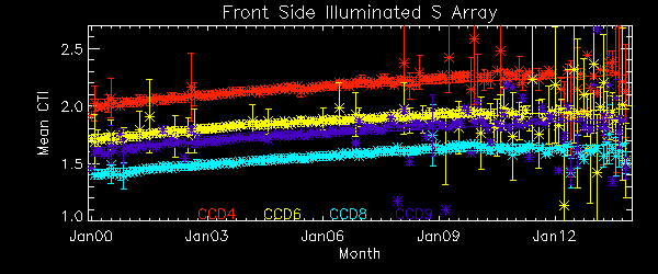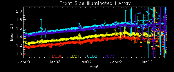 We report CTIs with a refined data definition. CTIs were computed for the temperature dependency corrected data. Please see CTI page for detailed explanation. CTI's are computed for Mn K alpha, and defined as slope/intercept x10^4 of row # vs ADU. Data file: here