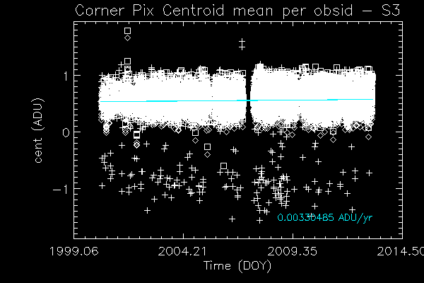 We plot the average corner pixel centroid slope and mean for ACIS observations. Separate plots are shown for FAINT MODE (3X3) and VFAINT MODE (5X5) observations. Metric is the centroid of a Gaussian fit to the histogram of corner pixel PHA values of detected events. Plus signs are FAINT observations, diamonds are VFAINT observations, and boxes are VFAINT observations with centroids computed using only the corner pixels of a 3X3 event island (referred to as AFAINT). We see a very small upward trend.