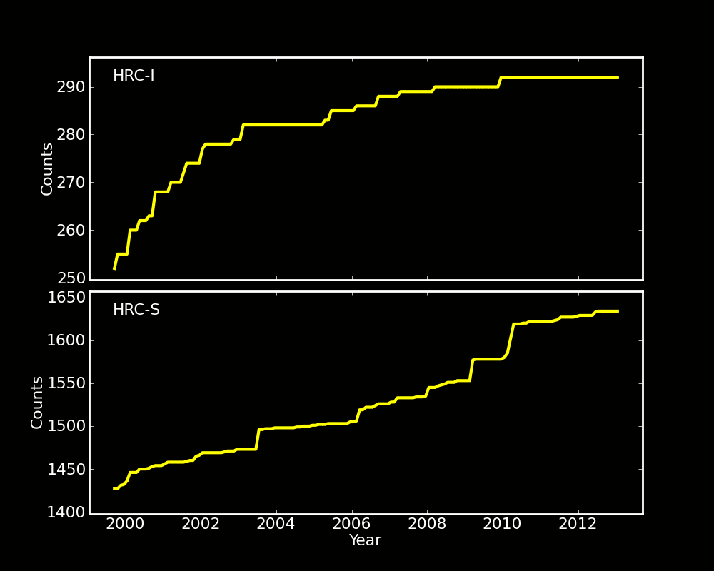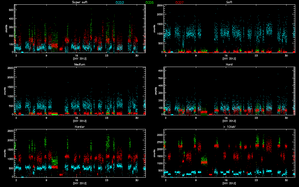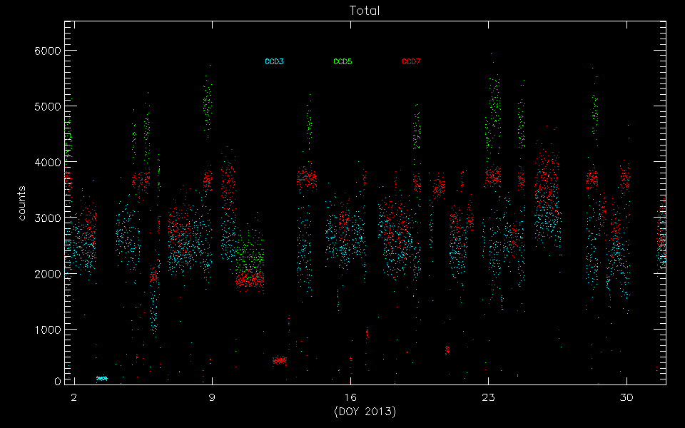 Statistics: # IMAGE NPIX MEAN RMS MIN MAX ACIS_jan13 6004901 7.358 12.667 0.0 6305 I2 node 0 262654 8.955242 3.694078 0.0 78.0 I2 node 1 262654 9.288125 4.189653 0.0 323.0 I2 node 2 262654 9.108322 3.673375 0.0 68.0 I2 node 3 262654 9.029960 6.006335 0.0 1597.0 I3 node 0 262654 9.395488 4.156511 0.0 48.0 I3 node 1 262654 9.642902 20.865034 0.0 6305.0 I3 node 2 262654 8.694185 3.554811 0.0 88.0 I3 node 3 262654 8.838242 3.643937 0.0 119.0 S2 node 0 262654 7.090234 12.419176 0.0 3500.0 S2 node 1 262654 7.065628 3.448234 0.0 50.0 S2 node 2 262654 7.268210 11.558255 0.0 5087.0 S2 node 3 262654 7.103668 4.257954 0.0 1353.0 S3 node 0 262654 16.240139 18.028760 0.0 194.0 S3 node 1 262654 14.239056 10.872723 0.0 131.0 S3 node 2 262654 12.463243 5.096620 0.0 56.0 S3 node 3 262654 11.087138 4.586701 0.0 53.0