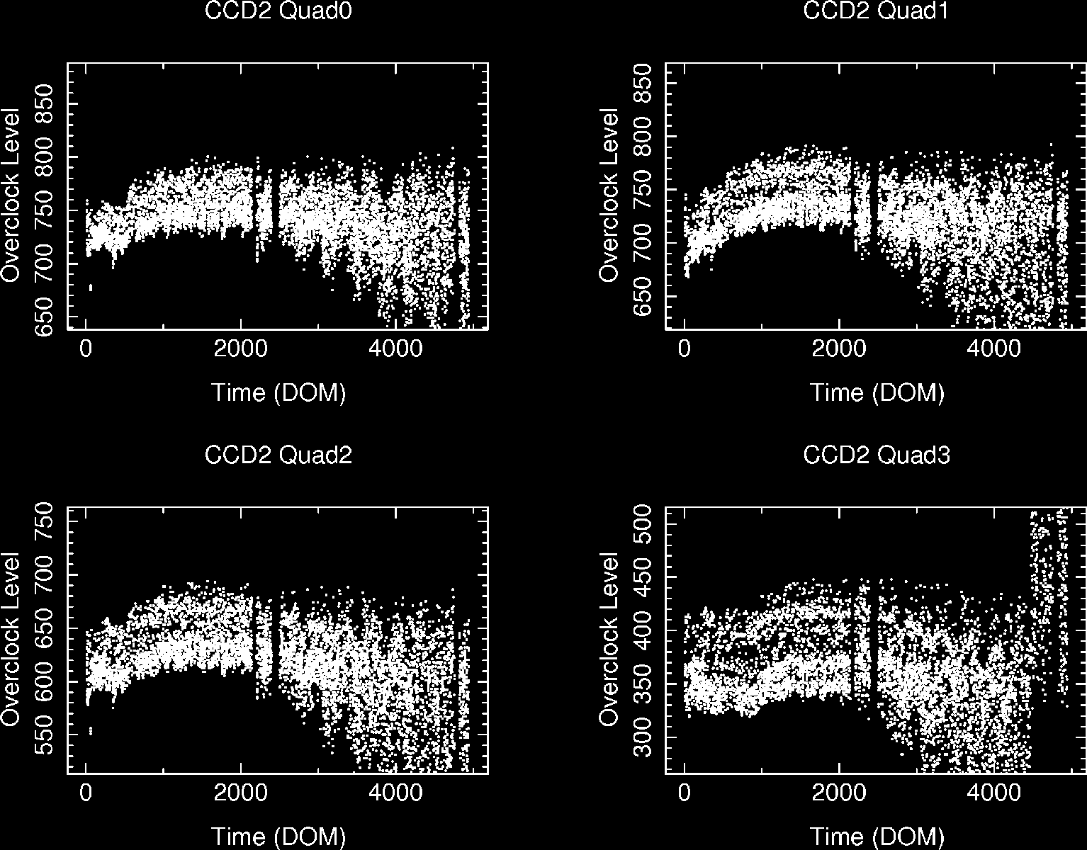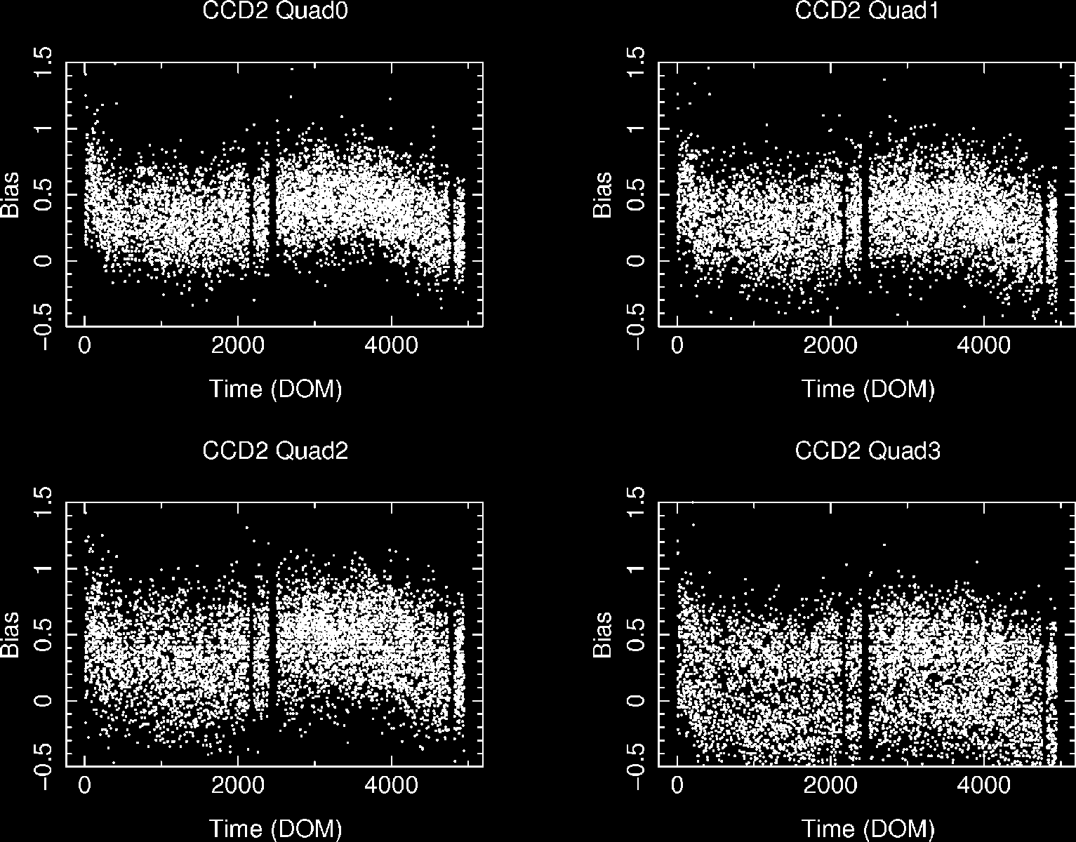 - Fits files were divided into 4 quads, then an average of bias level for each quad is computed. No corrections for dead spots, columns etc were included.