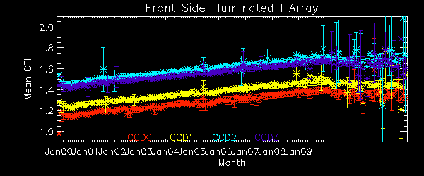 We report CTIs with a refined data definition. CTIs were computed for the temperature dependency corrected data. Please see CTI page for detailed explanation. CTI's are computed for Mn K alpha, and defined as slope/intercept x10^4 of row # vs ADU. Data file: here