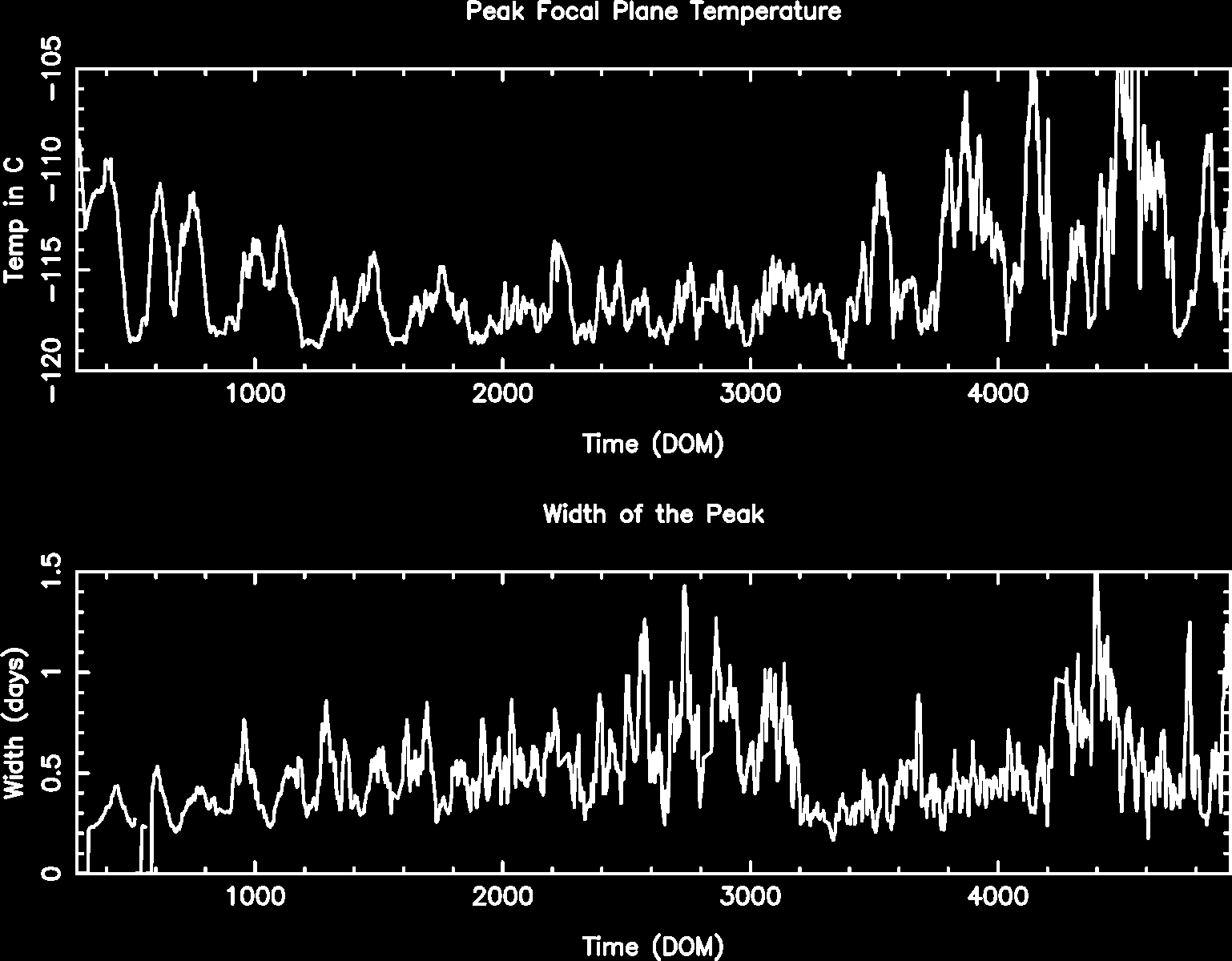 We are using 10 period moving averages to show trends of peak temperatures and peak widths. Note, the gaps in the width plot are due to missing/corrupted data.