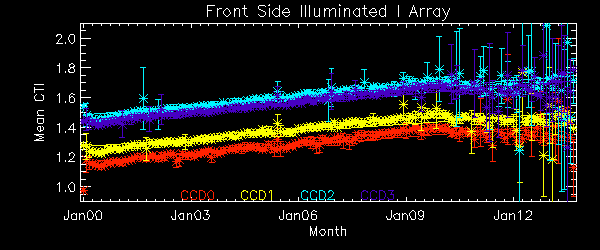 We report CTIs with a refined data definition. CTIs were computed for the temperature dependency corrected data. Please see CTI page for detailed explanation. CTI's are computed for Mn K alpha, and defined as slope/intercept x10^4 of row # vs ADU. Data file: here