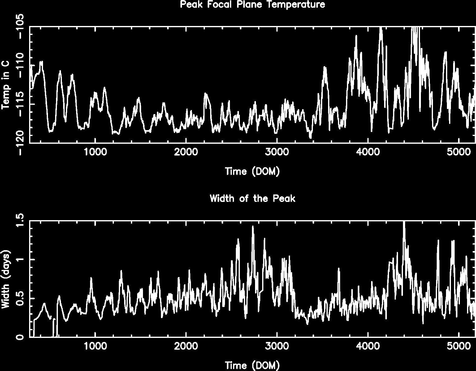 We are using 10 period moving averages to show trends of peak temperatures and peak widths. Note, the gaps in the width plot are due to missing/corrupted data.