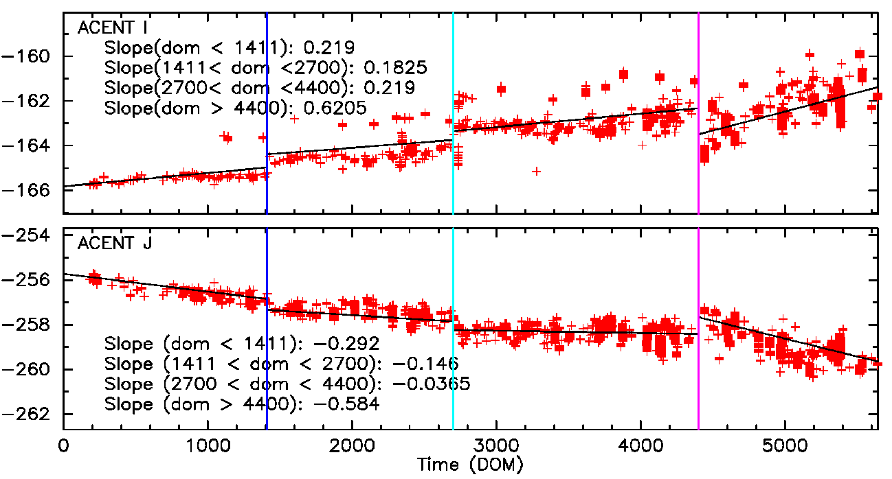 The top panel shows Fid light 2 drift in ACENT I (app. along with -Y axis), and the