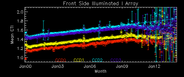 We report CTIs with a refined data definition. CTIs were computed for the temperature dependency corrected data. Please see CTI page for detailed explanation. CTI's are computed for Mn K alpha, and defined as slope/intercept x10^4 of row # vs ADU. Data file: here
