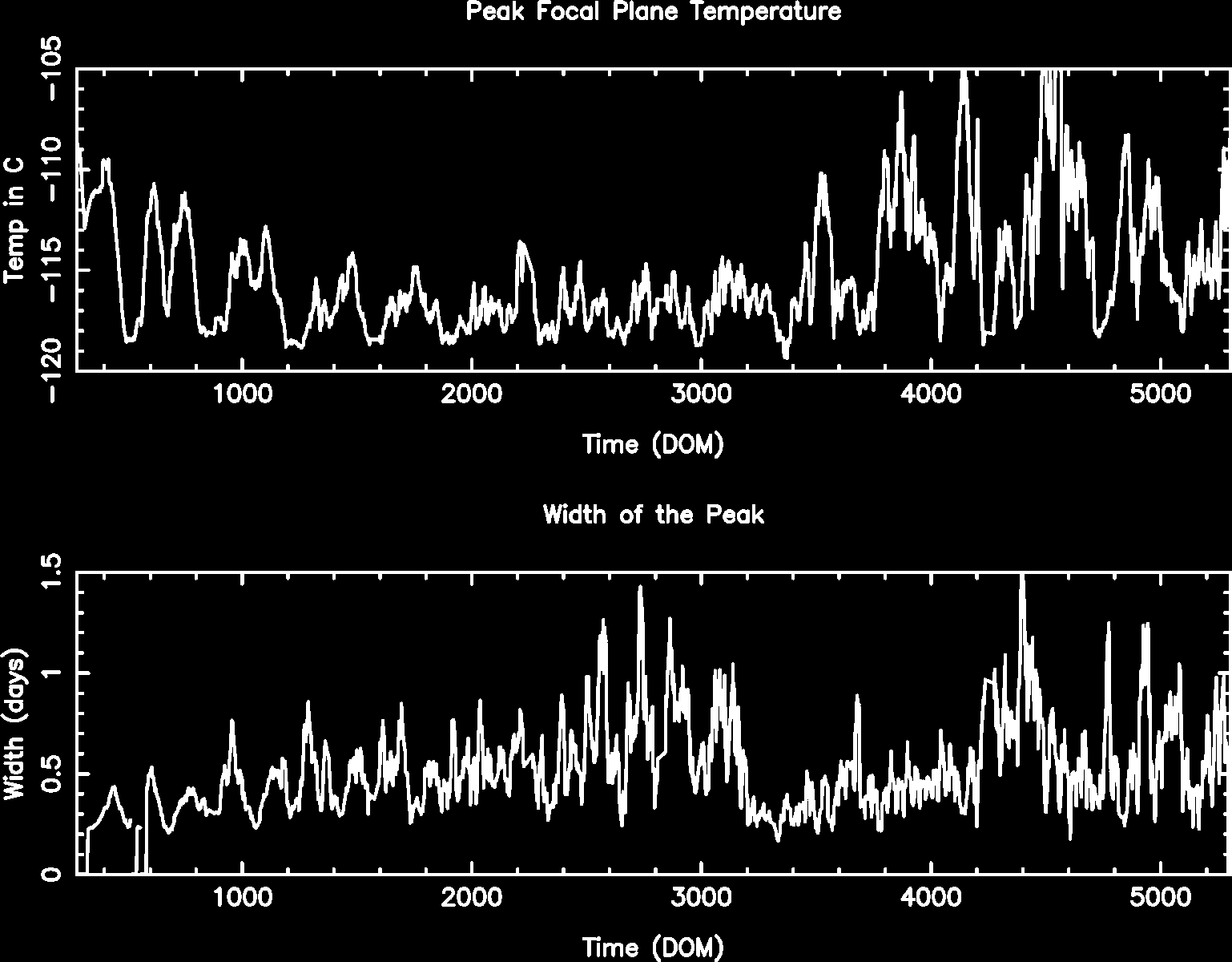 We are using 10 period moving averages to show trends of peak temperatures and peak widths. Note, the gaps in the width plot are due to missing/corrupted data.