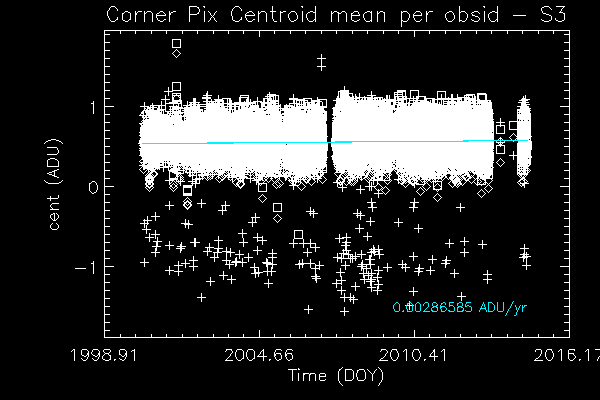 We plot the average corner pixel centroid slope and mean for ACIS observations. Separate plots are shown for FAINT MODE (3X3) and VFAINT MODE (5X5) observations. Metric is the centroid of a Gaussian fit to the histogram of corner pixel PHA values of detected events. Plus signs are FAINT observations, diamonds are VFAINT observations, and boxes are VFAINT observations with centroids computed using only the corner pixels of a 3X3 event island (referred to as AFAINT). We see a very small upward trend.