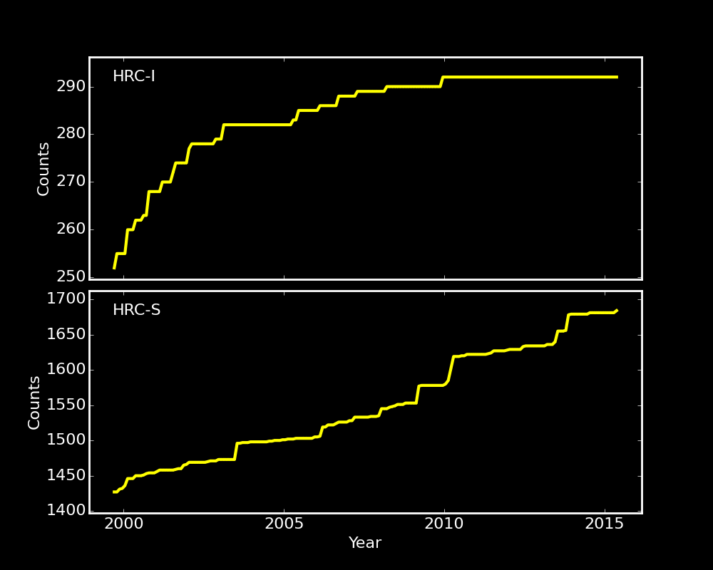 Statistics: IMAGE NPIX MEAN RMS MIN MAX ACIS_total 6004901 1893.172 2478.966 0.0 109032 I2 node 0 262654 1588.489149 304.637461 300.0 9116.0 I2 node 1 262654 1675.312964 422.050918 331.0 40142.0 I2 node 2 262654 1709.119752 360.949448 330.0 9245.0 I2 node 3 262654 1706.638753 431.677427 314.0 28066.0 I3 node 0 262654 1793.561376 429.335248 313.0 7011.0 I3 node 1 262654 1883.052035 1422.787205 320.0 35900.0 I3 node 2 262654 1641.854689 296.131313 302.0 8499.0 I3 node 3 262654 1626.825484 315.556816 285.0 27509.0 S2 node 0 262654 2209.064511 320.163435 1173.0 21242.0 S2 node 1 262654 2350.709695 514.067698 1234.0 12986.0 S2 node 2 262654 2595.408674 492.204671 1573.0 19673.0 S2 node 3 262654 2525.463515 354.776459 1484.0 43210.0 S3 node 0 262654 3931.133938 1803.672501 1624.0 13612.0 S3 node 1 262654 5157.733396 2117.353895 0.0 14088.0 S3 node 2 262654 3946.693876 1030.840795 1603.0 9596.0 S3 node 3 262654 3030.817546 464.653454 1737.0 10427.0