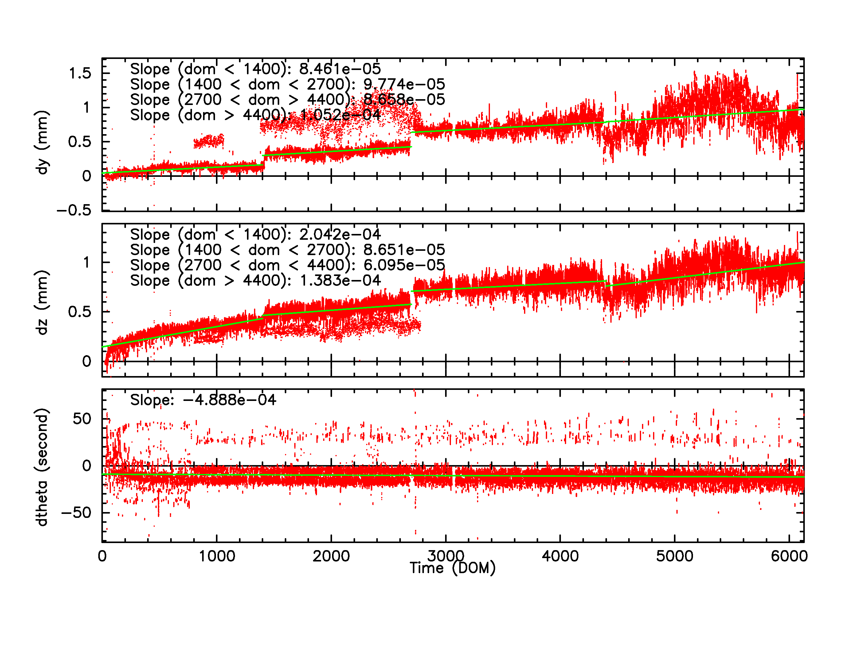 The sudden shift around DOM = 1400, 2700 and 4400 are due to fid light drift (see a memo by Aldcroft fiducial light drift). On the dtheta plot, two tracks are clearly observed. The track around 0.01 is due to HRC-I, and all others are clustered around -0.002. For more detail, please see SIM Shift and Twist Trend page