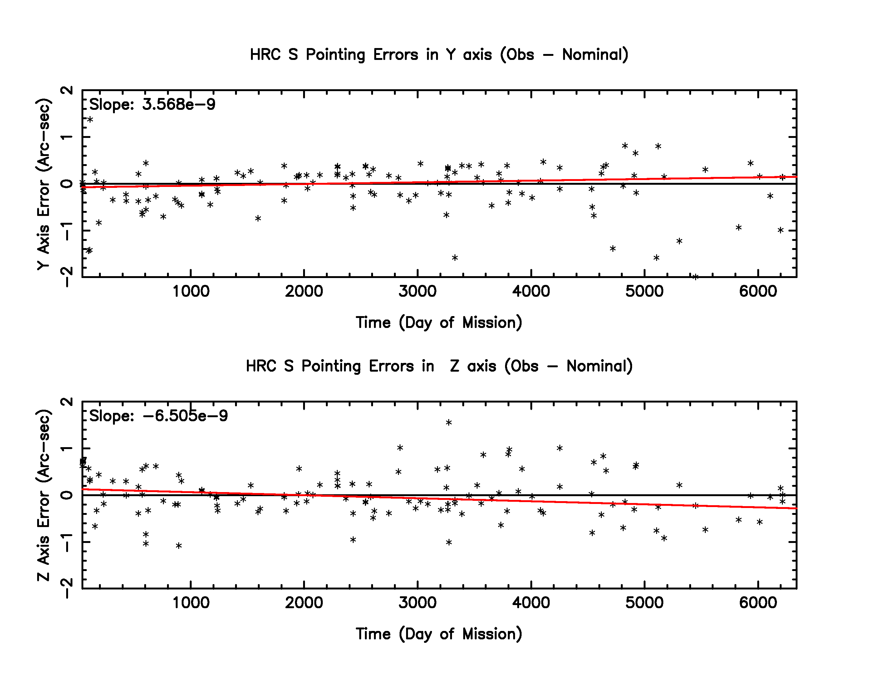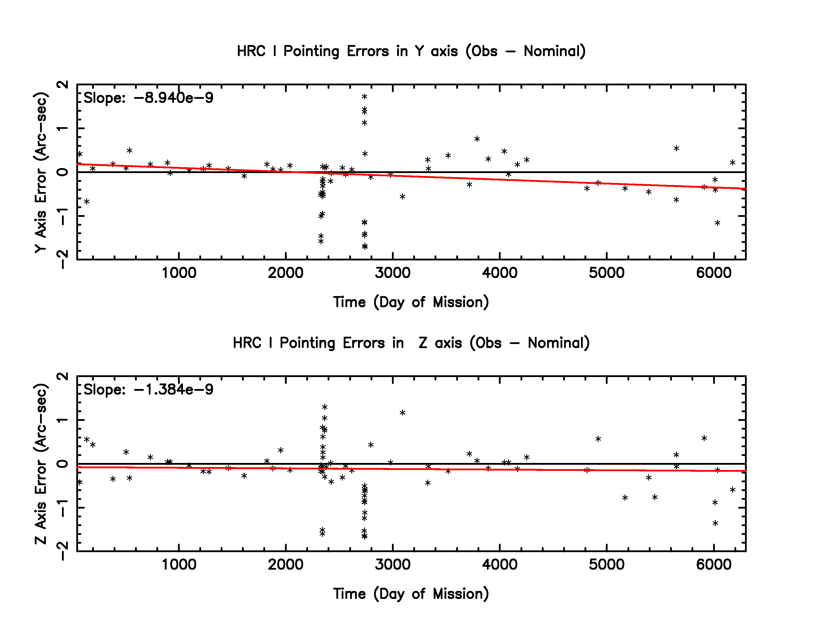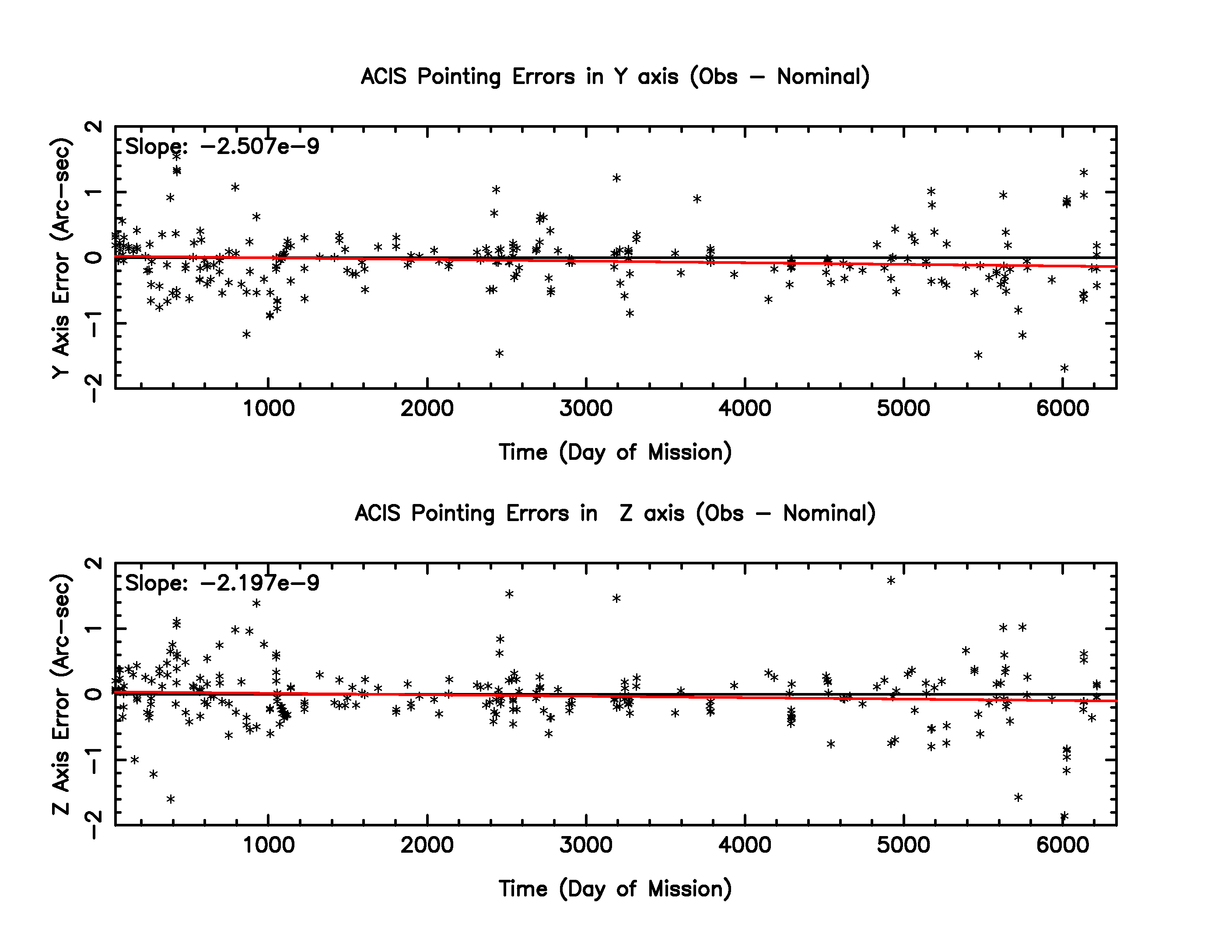The following plots are the difference between coordinates obtained from Chandra observations and those obtained from existing catalogs vs time in day of mission.