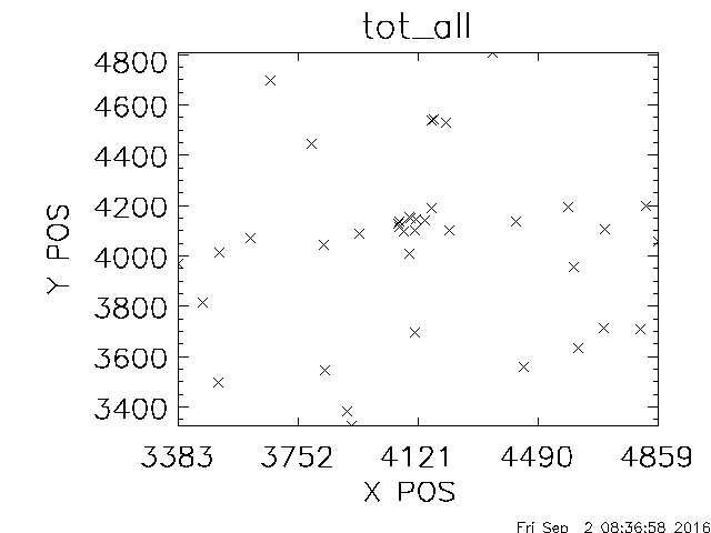Statistics: IMAGE NPIX MEAN RMS MIN MAX ACIS_total 6004901 2032.494 2649.700 0.0 116229 I2 node 0 262654 1736.877045 335.418070 355.0 9496.0 I2 node 1 262654 1829.294066 463.432888 371.0 53009.0 I2 node 2 262654 9.816230 3.929448 0.0 80.0 I2 node 3 262654 1860.282266 471.545387 357.0 28258.0 I3 node 0 262654 1963.973088 474.412429 355.0 7661.0 I3 node 1 262654 2053.389035 1560.814661 354.0 38885.0 I3 node 2 262654 1797.275580 326.307924 342.0 9737.0 I3 node 3 262654 9.820936 3.975768 0.0 165.0 S2 node 0 262654 2370.586696 346.882184 1272.0 21458.0 S2 node 1 262654 8.244705 3.920396 0.0 62.0 S2 node 2 262654 2777.398560 529.055405 1680.0 27388.0 S2 node 3 262654 2713.072569 382.296167 1578.0 47748.0 S3 node 0 262654 4222.980698 1862.563041 1750.0 13902.0 S3 node 1 262654 5399.243079 2145.682105 0.0 14360.0 S3 node 2 262654 4170.462079 1050.333367 1741.0 10048.0 S3 node 3 262654 3229.670495 486.775706 1856.0 10874.0