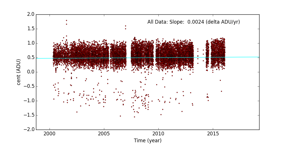 We report CTIs with a refined data definition. CTIs were computed for the temperature dependency corrected data. Please see CTI page for detailed explanation. CTI's are computed for Mn K alpha, and defined as slope/intercept x10^4 of row # vs ADU. Data file: here