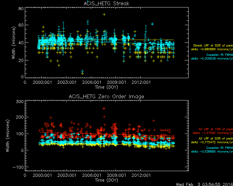 We plot the width of the zero order streak of ACIS/HETG observations and the width of the zero order image for HRC/LETG observations of point sources. No significant defocusing trend is seen at this time. See Gratings Focus pages.