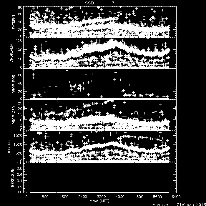 The links below are plots of stat1 quantities, showing on-board rejected events. The average EVTSENT, DROP_AMP, DROP_POS, DROP_GRD, THR_PIX, and maximum BERR_SUM obtained from L1 acis*stat1.fits files are plotted for each observation. CTI observations are plotted separately from regular science observations.