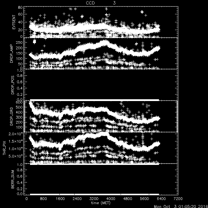 The links below are plots of stat1 quantities, showing on-board rejected events. The average EVTSENT, DROP_AMP, DROP_POS, DROP_GRD, THR_PIX, and maximum BERR_SUM obtained from L1 acis*stat1.fits files are plotted for each observation. CTI observations are plotted separately from regular science observations.