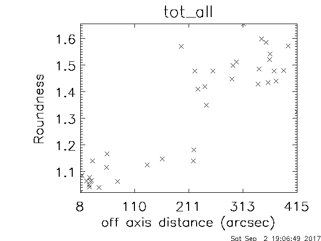 Plots below show various characteristics of detected imaging sources. Standard level 2 data products (*src2.fits) are used. Only observations with focus (sim_x) within 0.01 mm of nominal value for given SI configuration are used. Sources are also filtered for strength (SNR > 15).